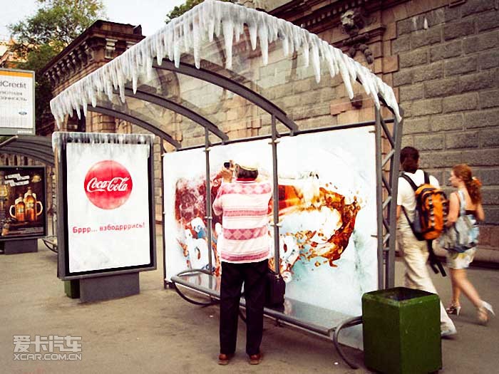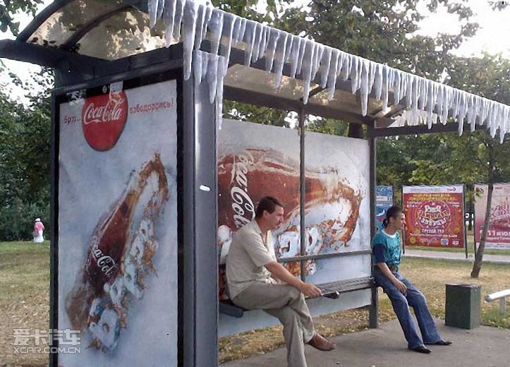 可口可樂汽車亭廣告——炎炎夏日,冰雪造型為你帶來一絲涼爽之意。燈箱上那個還寫著“Wash youself”