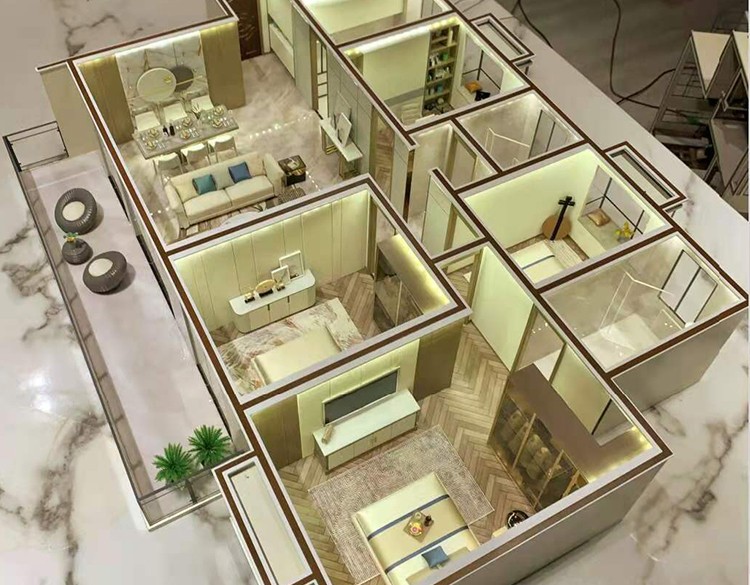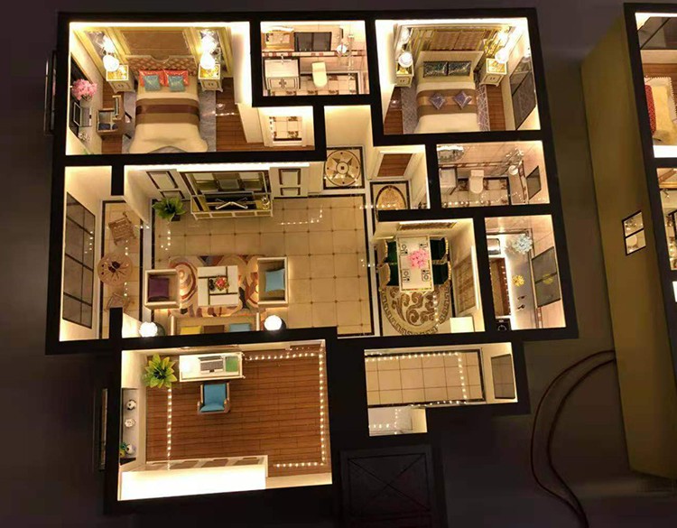 為了更能突出居室內(nèi)部的效果,我們在燈光設(shè)置方面先進(jìn)的科技技術(shù),通過實(shí)際的局部設(shè)計(jì)壁燈、落地?zé)簟⒋差^燈、水晶吊燈等表現(xiàn)出來并能發(fā)光,通過戶內(nèi)的裝飾效果與燈光效果相襯托,把整個(gè)剖面模型的居家氣氛表現(xiàn)出來。為了更好營造模型采用進(jìn)口材料和裝飾品,并且能夠以歐式、美式等不同裝修風(fēng)格呈現(xiàn),打造出戶型的獨(dú)特風(fēng)韻。